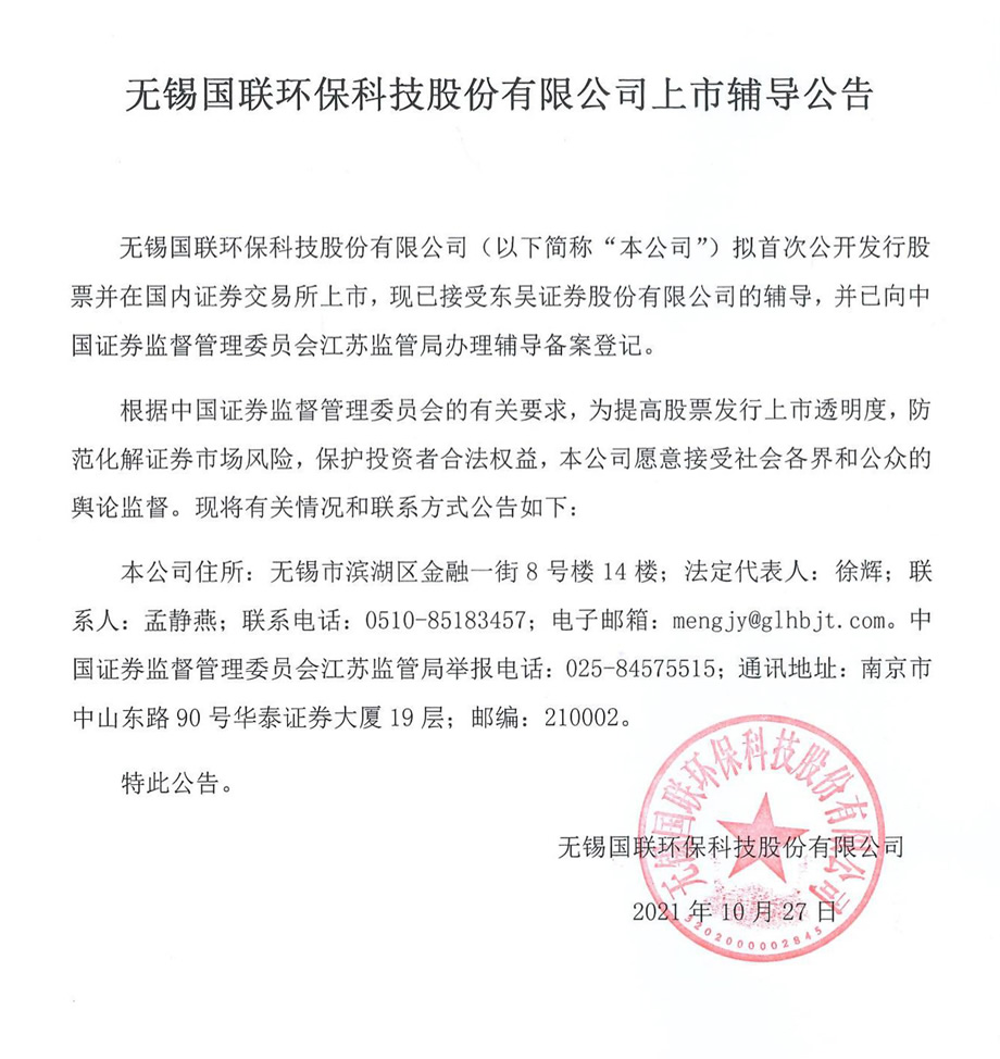 無錫國聯(lián)環(huán)??萍脊煞萦邢薰境闪⒂?011年1月27日,是一家以污泥減量化、無害化、資源化處置為產(chǎn)業(yè)化發(fā)展的國有控股企業(yè),股本為109,470,852元。